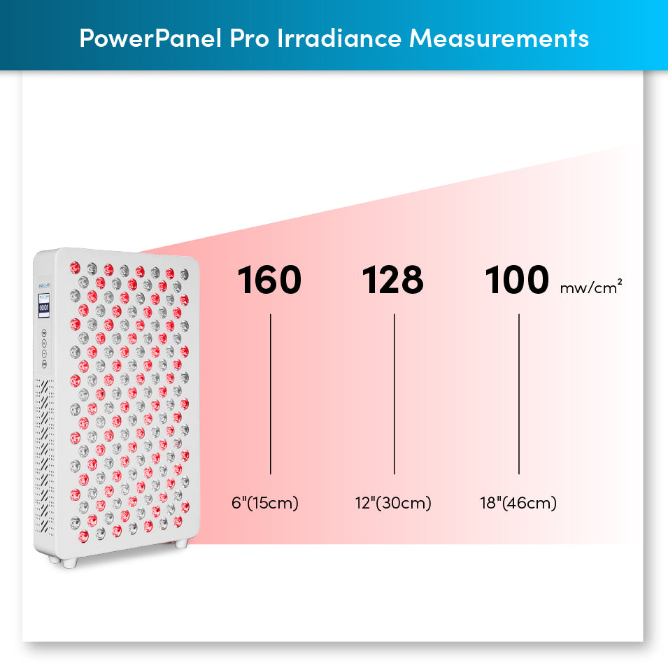 At a distance of 6 inches, the PowerPanel PRO delivers up to 160mW/cm² (measured using a solar meter) and maintains an average of 68mW/cm² at the same distance based on Light Spectrometer verified readings, ensuring consistent and effective light exposure for your wellness needs.