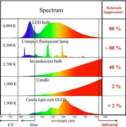 The image provided illustrates the difference in the levels of blue light emitted by various light bulbs and the impact it has on melatonin production, making it clear that some sources of light emit more blue light than others.